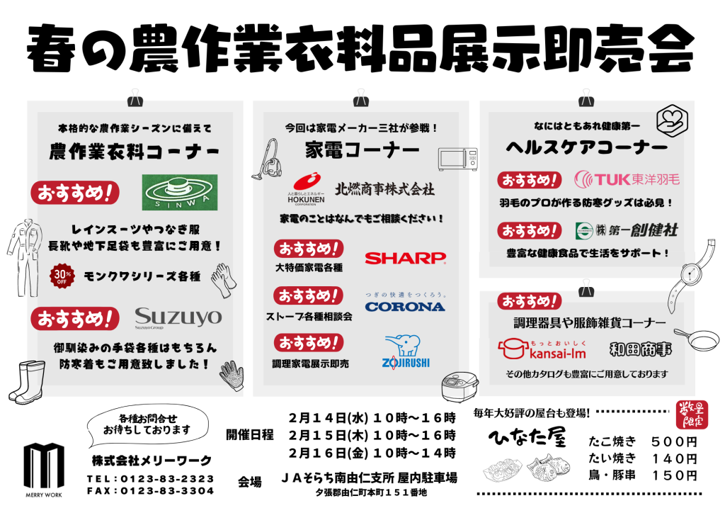 今年度も、JAそらち南由仁支所特設会場にて”春の農作業衣料展示会”を実施致しました!🙌🏽